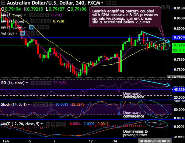 Bearish engulfing and long-legged doji patterns have occurred at 0.7923 and 0.7921 levels respectively that have currently evidenced considerable price slumps below SMAs.