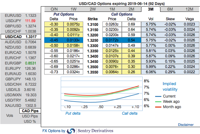 3M ATM IVs are trending a shy above 6.26% - 6.58%, skews are also suggesting the odds on OTM call strikes up to 1.36 levels at this juncture. We could also notice bullish neutral risk reversals that signal upside risks in the risk-neutral distribution of returns. Also, the IV curve is at, or slightly decreasing, with maturity.