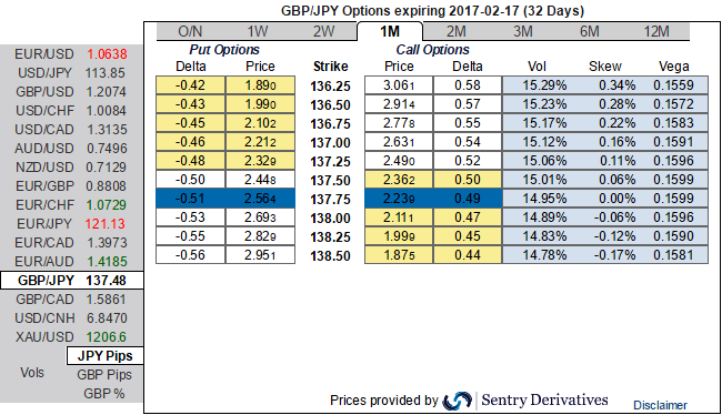 The trend monitoring: the major downtrend and short-term upswings into consideration, anyone who wishes to carry long GBPJPY exposures, a collar options trading strategy is recommended. This could be constructed by holding a total number of units of the underlying spot FX while simultaneously buying a protective put and shorting call option against that holding. The puts and the calls are both OTM options having the same expiration month and must be equal in a number of contracts.