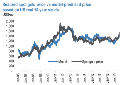 The implications for gold are both critical and massively divergent. J.P. Morgan's projections for increasing US 10Y real yields would imply gold prices moving back down towards $1,330/oz, while the current market expectations would result in an implied gold price between $1,800/oz and $1,900/oz by 2Q’20, depending on the precise beta and inflation expectations applied. Courtesy: JPM