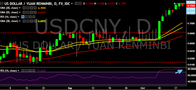 We prefer to take long position in USD/CNY around 6.7340, stop loss at 6.7055 and target of 6.7583/6.7718/6.8158.