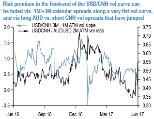 The second issue is that the new strong FX policy, if that is indeed what this is, seems to be inconsistent with the broader macro narrative of deleveraging and structural growth slowdown with attendant outward pressure on capital flows, and hence potentially subject to durability risk if financial stability regulation over-tightens domestic financial conditions. The bear argument is that absent broad USD strength that militates against Chinese policy preferences, a strong CNY bias should be inherently vol reducing in line with longstanding spot-vol directionality.