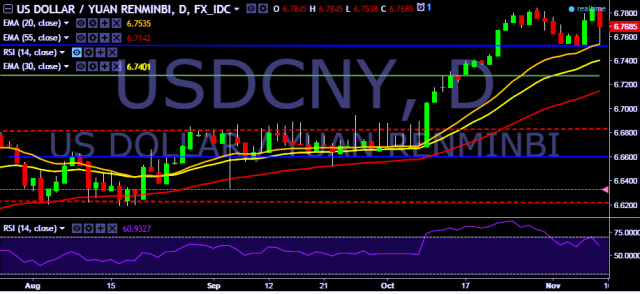 We prefer to take long position in USD/CNY around 6.7620, stop loss at 6.7540 and target of 6.7845/6.8025.