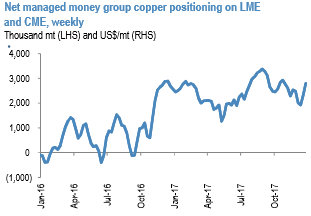 In copper, reversing relatively steady declines through November and the beginning of December, combined net long managed money positioning on the LME and COMEX increased more than 870 kmt in the last two weeks of data to nearly 2.8 mmt (refer above diagram).
