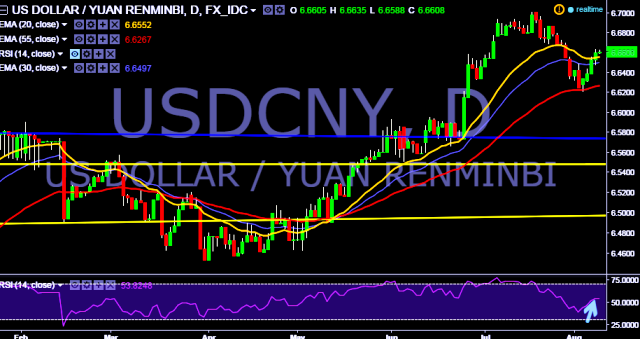 We prefer to take long position in USD/CNY around 6.66, stop loss 6.6473 and target 6.6876.