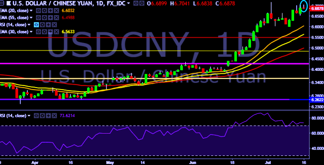 We prefer to take long position on USD/CNY only above 6.7050, stop loss 6.6518 and target of 6.7444.