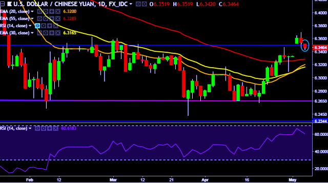 We prefer to take short position on USD/CNY around 6.3490, stop loss 6.3610 and target of 6.3210.