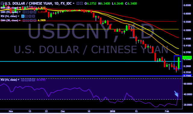 We prefer to take long position on USD/CNY around 6.3200, stop loss at 6.2648 and target of 6.3649/6.3855.
