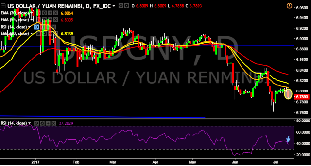 We prefer to take short position in USD/CNY around 6.7950, stop loss at 6.8070 and target of 6.7757.