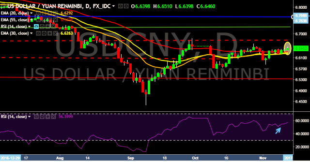 We prefer to take long position on USD/CNY only above 6.6510, stop loss at 6.6398 and target of 6.6673.