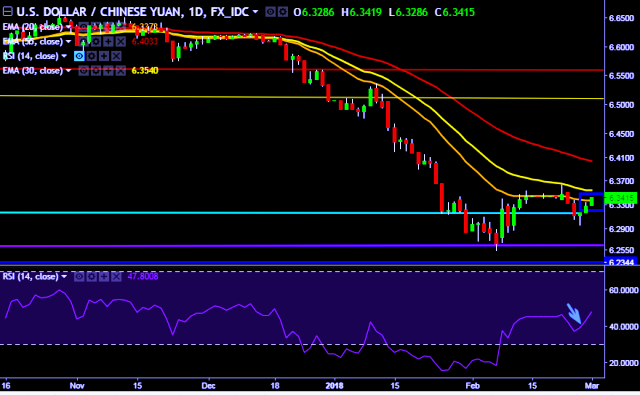 We prefer to take long position on USD/CNY around 6.3380, stop loss at 6.3168 and target of 6.3625.