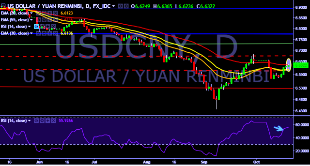 We prefer to take long position in USD/CNY around 6.6290, stop loss at 6.6210 and target of 6.6550.