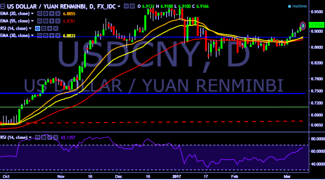 We prefer to take long position in USD/CNY around 6.9150, with stop loss at 6.8983 and target of 6.9336/6.9365.