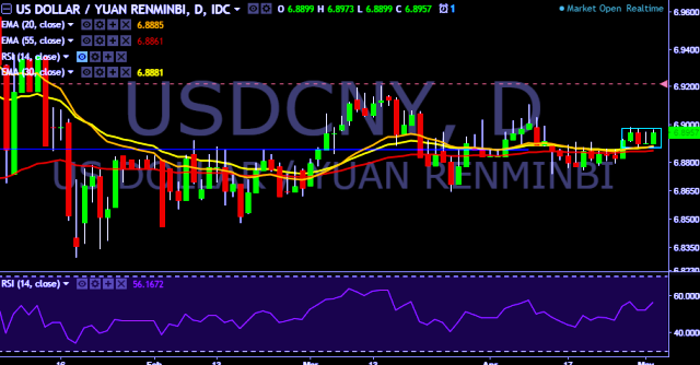 We prefer to take long position in USD/CNY around 6.8948, stop loss at 6.8899 and target of 6.8993/6.9107.