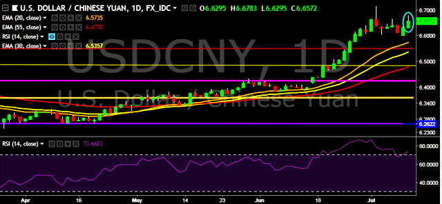 We prefer to take long position on USD/CNY around 6.6520, stop loss 6.6295 and target of 6.7167.