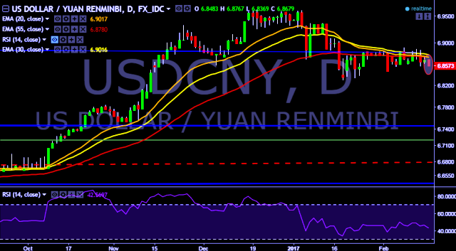 We prefer to take short position in USD/CNY around 6.86, stop loss at 6.8751 and target of 6.8465/6.8359.