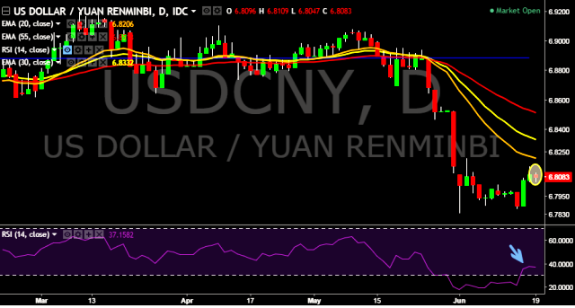 We prefer to take long position in USD/CNY only above 6.8109, stop loss at 6.7887 and target of 6.8526.