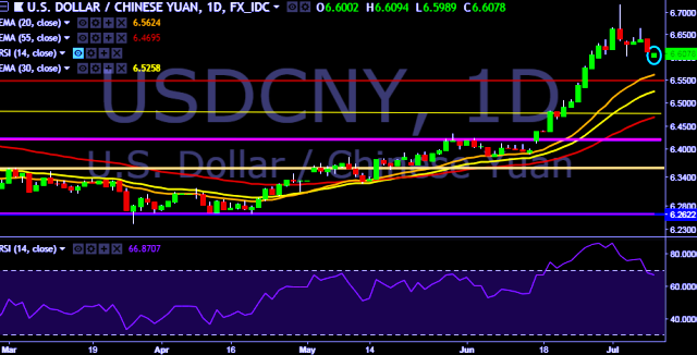 We prefer to take short position on USD/CNY only below 6.5989, stop loss 6.6300 and target of 6.5500.