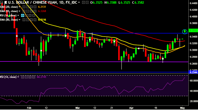 We prefer to take long position on USD/CNY around 6.3520, stop loss 6.3210 and target of 6.4017.