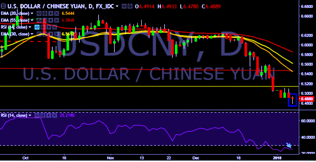 We prefer to take short position on USD/CNY around 6.4845, stop loss 6.5092 and target of 6.4535.