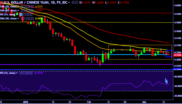 We prefer to take short position on USD/CNY around 6.3170, stop loss at 6.3322 and target of 6.3092/6.2942.