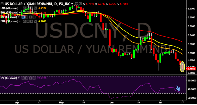 We prefer to take short position in USD/CNY around 6.7710, stop loss at 6.7850 and target of 6.7607/6.7520.