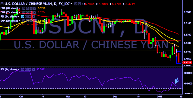 We prefer to take short position on USD/CNY below 6.4750, stop loss 6.5050 and target of 6.4535/6.4426.