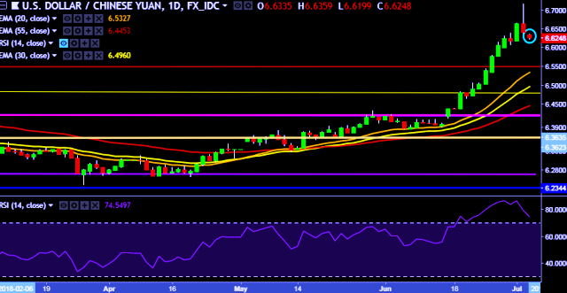 We prefer to take long position on USD/CNY only above 6.6400, stop loss 6.6055 and target of 6.6660/6.6855.