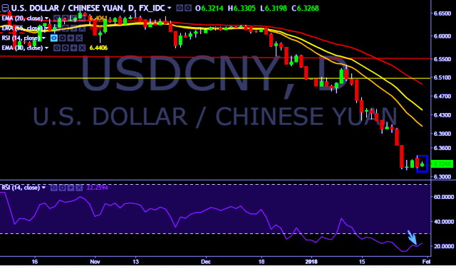 We prefer to take long position on USD/CNY around 6.3210, stop loss 6.3125 and target of 6.3649.