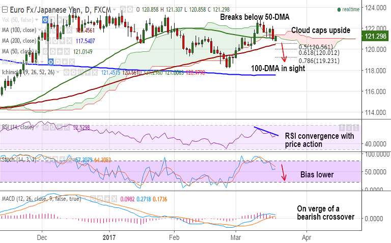 - Pair is on track to test 100-DMA at 120.45, violation there could see further downside upto 120 levels.