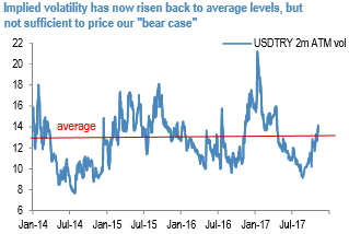 We have a preference for entering bearish positions in the currency, as the CBRT is likely to only hike rates in response to currency weakness, and hence, we keep a larger FX UW relative to duration. In outright trades, we recommend buying a 2m 4.10 USDTRY call. The option market has so far priced in only a moderate deterioration in the outlook for lira with close to average levels of implied volatility and skew (refer above charts).