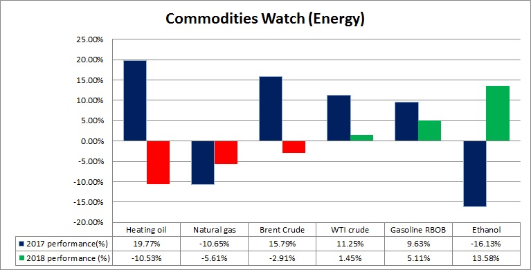 - So far in 2018, Ethanol has been the best performer with 13.6 percent gain, followed by Gasoline (5.1 percent), and WTI crude (1.45 percent).