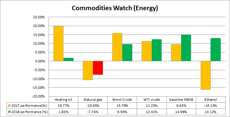 - So far in 2018, Gasoline RBOB has been the best performer with 15 percent gain, followed by Ethanol (+13.1 percent), WTI crude (+12.4 percent), Brent crude (+9.6 percent), and Heating oil (+1.8 percent).