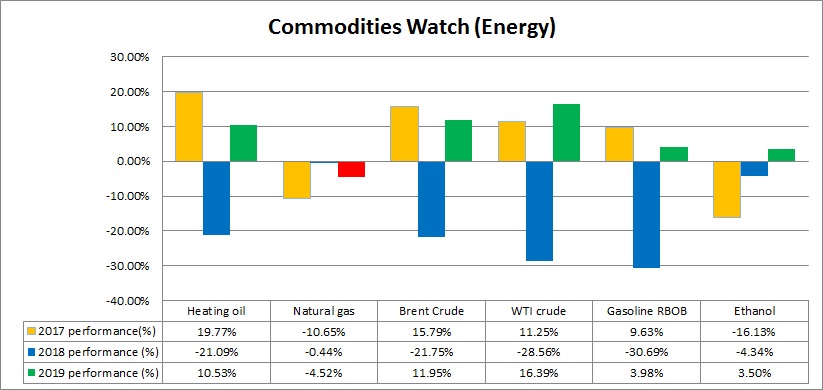 - In 2019, WTI crude is the best performer with 16.4 percent gain, followed by, Brent crude (+12 percent), Heating oil (+10.5 percent), Gasoline (+4 percent), and Ethanol, which is up 3.5 percent.