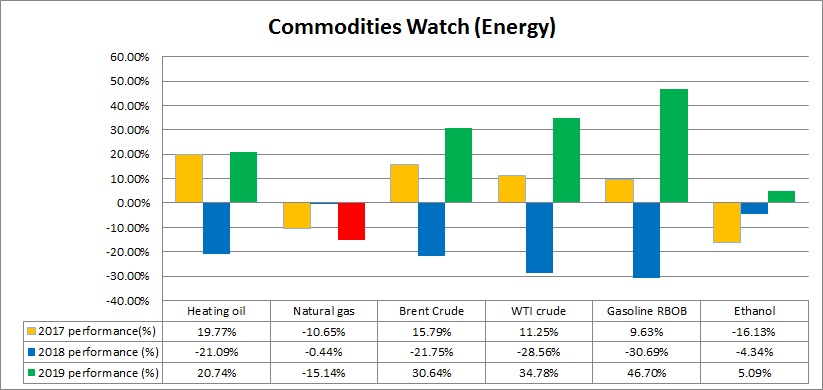 - In 2019, Gasoline is the best performer with 46.7 percent gain, followed by, WTI crude (+34.8 percent), Brent crude (+30.6 percent), Heating oil (+20.7 percent), and Ethanol, which is up 5.1 percent.