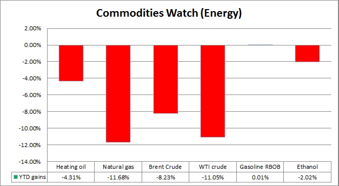 - The worst performer is Natural gas (-11.7 percent), followed by WTI crude (-11 percent), Brent crude (-8.2 percent), Heating oil (-4.3 percent), and Ethanol (-2 percent).