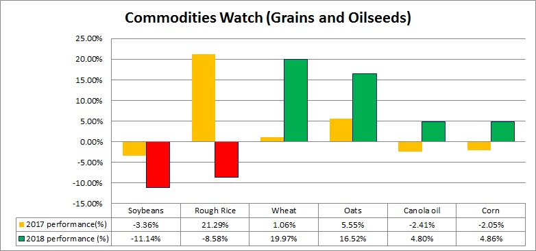 So far in 2018, Wheat has been the best performer with 20 percent gain, followed by Oats (+16.5 percent), Corn (+4.9 percent), and Canola oil (+4.8 percent).
