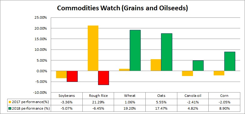 So far in 2018, Wheat has been the best performer with +19.2 percent gain, followed by Oats (+17.5 percent), Corn (+8.9 percent), and Canola oil (+4.8 percent)