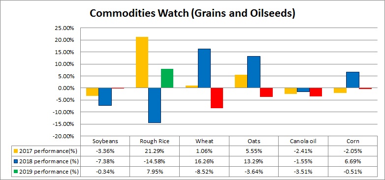 In 2019, rough rice the best performer with +7.9 percent gain.