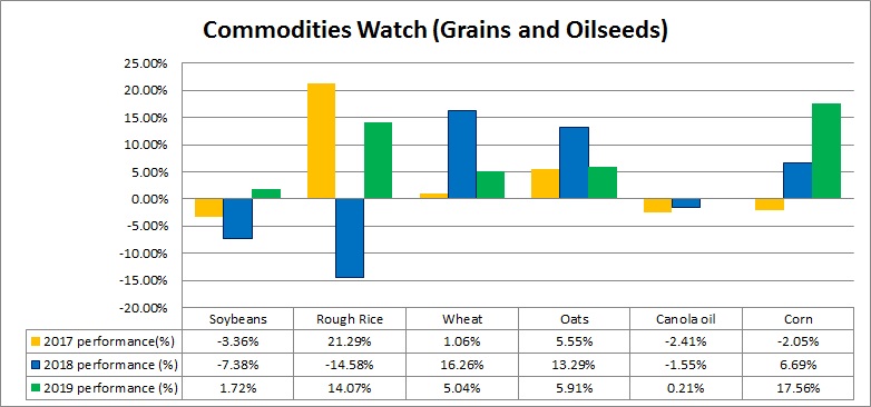 In 2019, Corn the best performer with +17.6 percent gain, followed by Rough Rice (+14.1 percent), Oats (+5.9 percent), Wheat (+5 percent), Soybeans (+1.7 percent), and Canola oil (+0.2 percent).