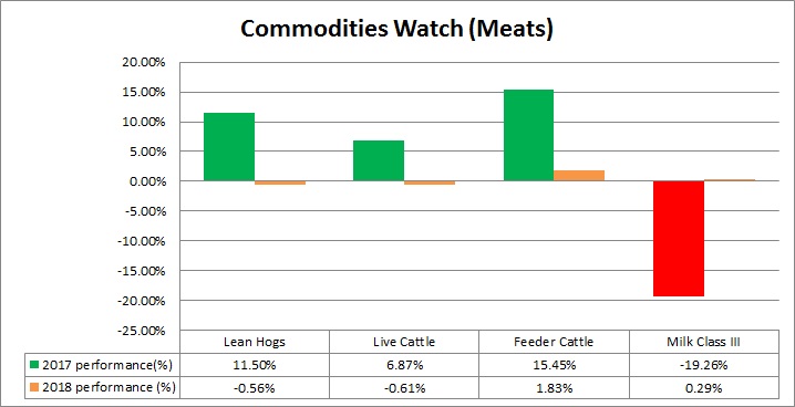 So far, in 2018 the pack is up just 0.24 percent, with feeder cattle being the best performer again (+1.8 percent) and live cattle being the worst (-0.6 percent).