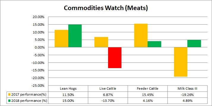 - The best performer of the pack is Lean Hogs (+15 percent), followed by Milk Class III (+4.9 percent), and Feeder Cattle (4.2 percent).
