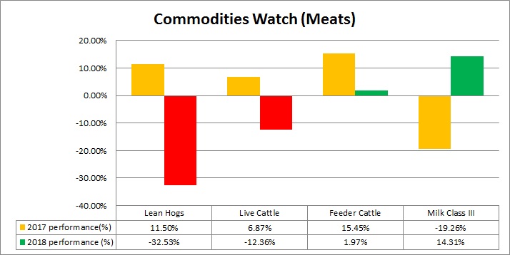 - This pack hasn’t done well in 2018. The worst performer of this pack has been Lean hogs (-32.5 percent), followed by Live Cattle (-12.4 percent)