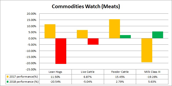 - This pack hasn’t done well in 2018. The worst performer of this pack has been Lean hogs (-20.5 percent), followed by Live Cattle (-5 percent)