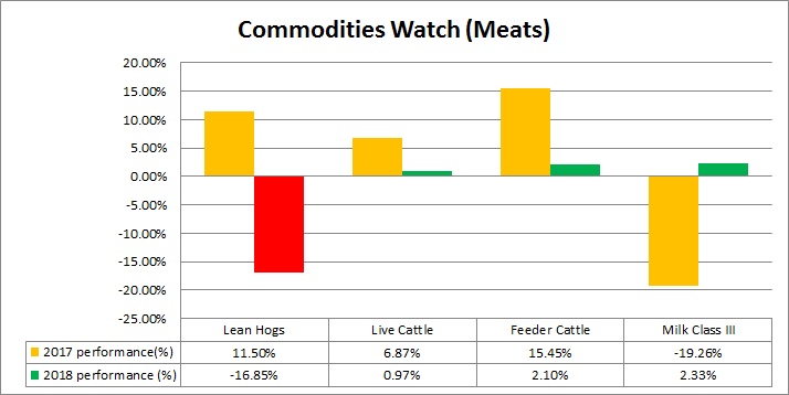 - This pack hasn’t done well in 2018. The worst performer of this pack has been Lean hogs (-16.85 percent).