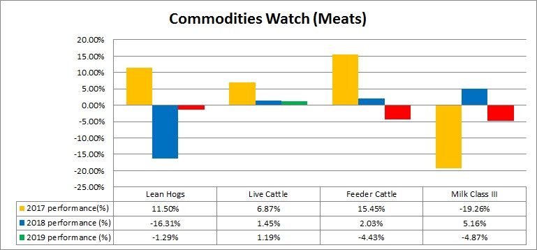 - The worst performer of this pack was Milk Class III (-4.9 percent), followed by, Feeder Cattle (-4.4 percent), and Lean Hogs (-1.3 percent).