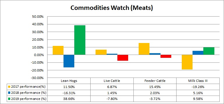 - The best performer of this pack is Lean Hogs, which is up 38.7 percent so far in 2019, followed by Milk Class III (+9.6 percent).