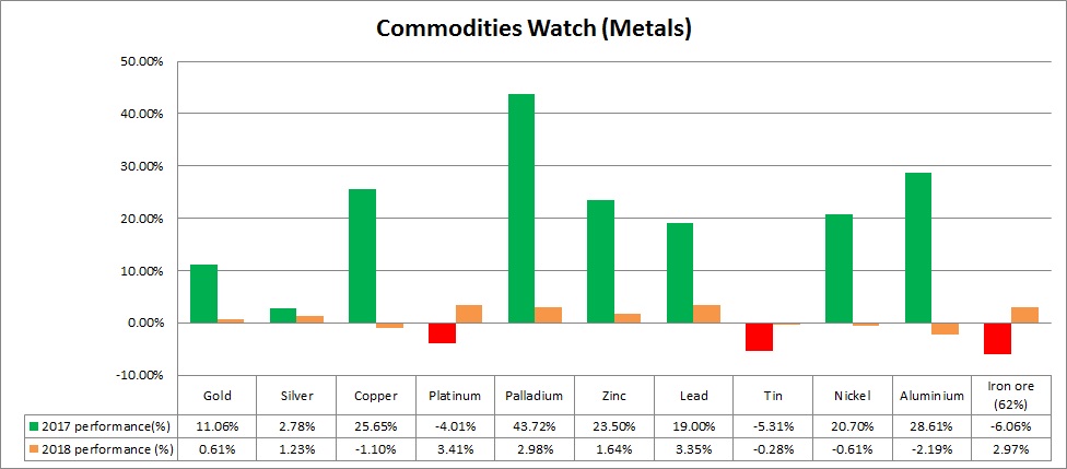 The pack is up 1.1 percent so far in 2018, with Platinum being the best performer (+3.4 percent) and Aluminum being the worst (-2.2 percent).