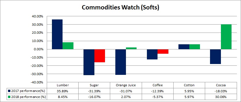 - So far in 2018, Cocoa has been the best performer with 30 percent gains, followed by Lumber (8.45 percent), Cotton (6 percent), and Orange Juice (+2.1 percent).