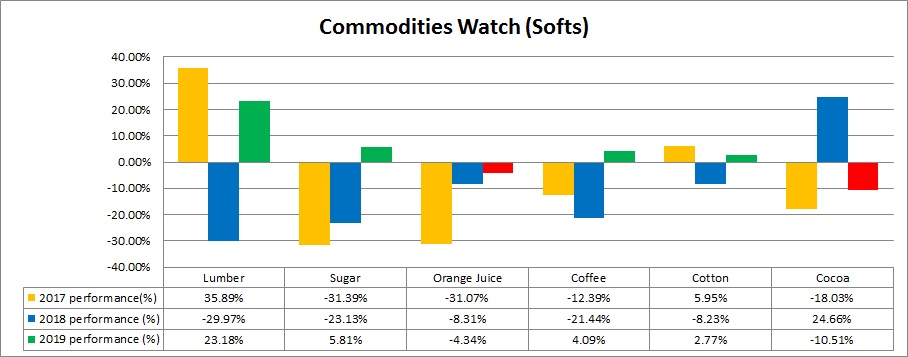 - In 2019, Lumber the best performer with 23.2 percent gain, followed by Sugar (+5.8 percent), Coffee (+4.1 percent), and Cotton (+2.8 percent).